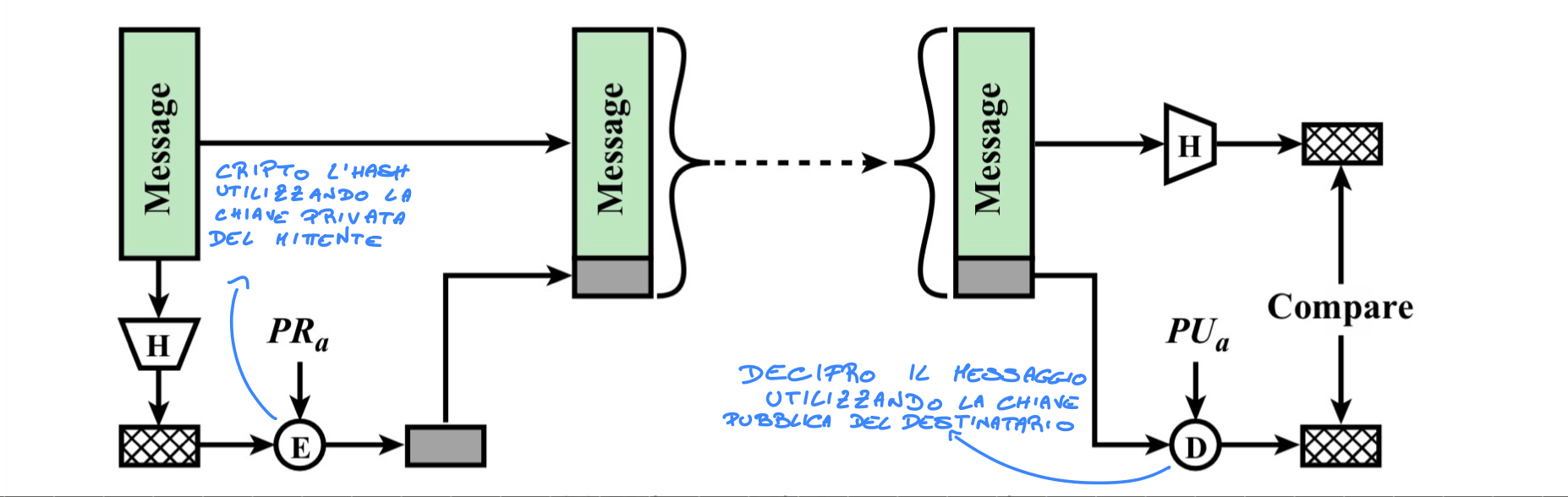 Attraverso la chiave pubblica della CA, decifra la firma e la confronta con l’hash calcolato precedentemente, per verificare l’autenticità del mittente.